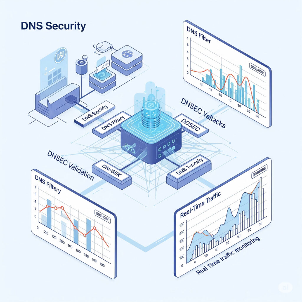 Our DNS Security service protects your Domain Name System (DNS) infrastructure from various malicious activities. We defend against attacks like DNS spoofing, DDoS attacks on DNS servers, and DNS tunneling. The service includes DNS filtering to block malicious domains, implements DNSSEC for data authenticity, and continuously monitors traffic for anomalies. By integrating threat intelligence and securing both recursive and authoritative DNS, we ensure reliable and secure internet access for your organization
