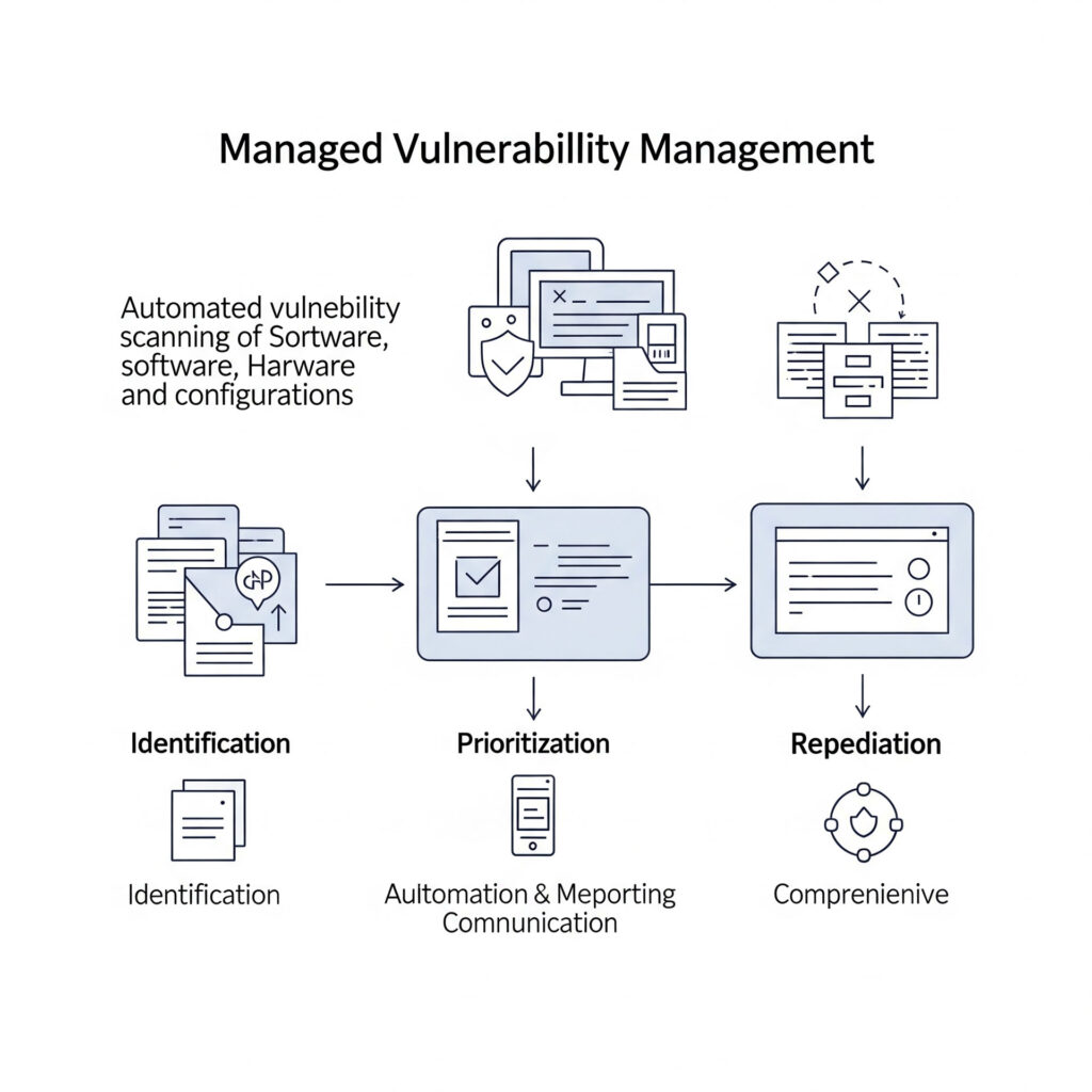 Our Managed Vulnerability Management service provides continuous identification and remediation of security weaknesses across your IT environment, significantly reducing your organization’s attack surface. Vulnerabilities are flaws in software, hardware, or configurations that attackers can exploit. Proactive and ongoing management of these weaknesses is essential to prevent breaches. Our service includes: