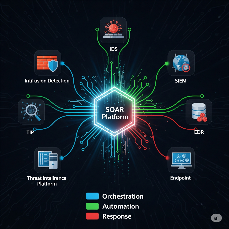 Automating repetitive, mundane, and time-consuming tasks that typically bog down security analysts. Through pre-defined workflows known as "playbooks," SOAR can automatically enrich alerts with contextual data, block malicious IPs, quarantine infected endpoints, open incident tickets, and much more, at machine speed.